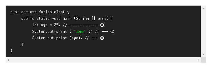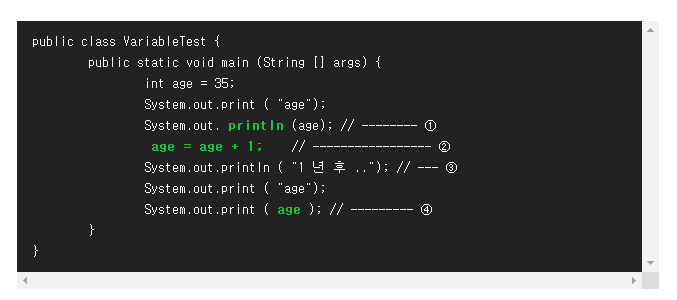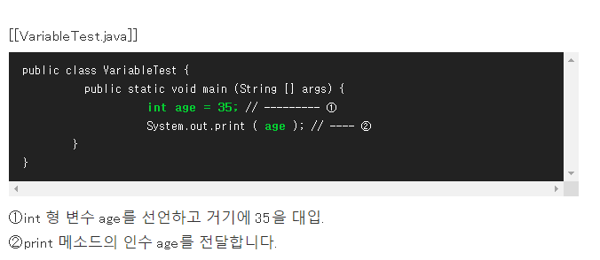 ①int 변수 age를 선언하고, 거기에 35을 대입.